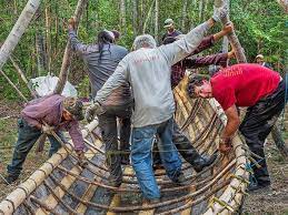 The Moosehide boat was a fascinating structure, similar to canoes and European boats, with ribs and a keel. To be perfectly clear, this was not the first moosehide boat built in a hundred years. One was built in 1981 for the Prince of Wales Northern Heritage centre, for example. And others had been built before. But this build and this launch were captured by a documentarian and exposed First Nations people who had not had a chance to experience the build or the voyage before.