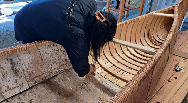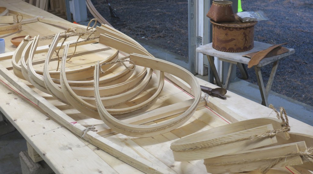 Like many Indigenous builds I have studied, Labrador goes with what works when he feels it doesn’t compromise the intent. He uses some wood that is easier to bend and work with than what was used by his ancestors, or harder and more long-lasting. And instead of boiled spruce sap (mixed with bear fat and ash), he uses modern sealant.