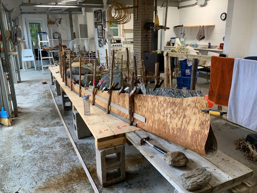 The build for the Canadian Canoe Museum was an ocean-going vessel of the Mi’kmaw style, over 20feet in length. While Indigenous nations across Turtle Island (North America) have their own canoe styles, this one is specific to the Mi’kmaq as well as having its own modern updates. A birchbark hull and sewn spruceroots is fairly standard, of course, but this iteration also uses clear cedar for the ribs (as opposed to more traditional Nova Scotia Spruce), and a variety of other hardwoods for planks, pegs, and gunwales.