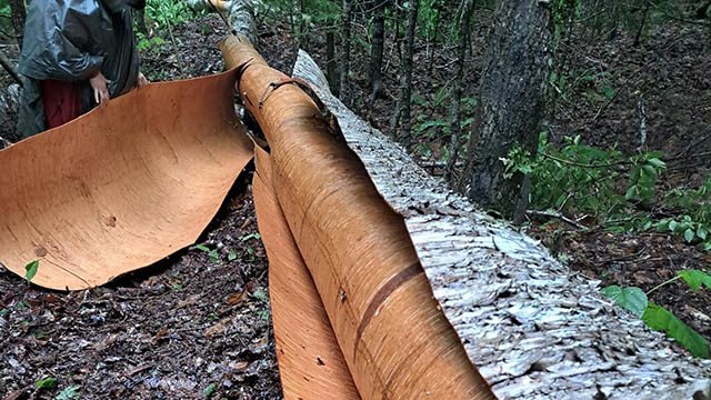 “In Todd’s experience, removing more than four to six feet of bark from a live standing tree and cutting through the cambium (the inner bark), can cause a tree to die within two years or sooner, depending on the health of the tree. Todd has taken fifteen to twenty feet of bark off a live tree and the tree died within a year and the cambium cracked and started to fall off the tree. It is best to just cut the tree down and use the wood for making paddles, thwarts, or firewood. Todd says, “We are always told not to waste and to have respect for the gifts that our Mother Earth has provided for us.”” (Parks Canada)