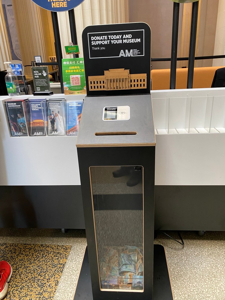 Grant-funding might be available to help you set up “tap” donation systems as fewer and fewer visitors carry cash money. You may notice this box also sends a powerful message about whose museum this is (“…support your museum”), and thus implies a responsibility it is to support it.