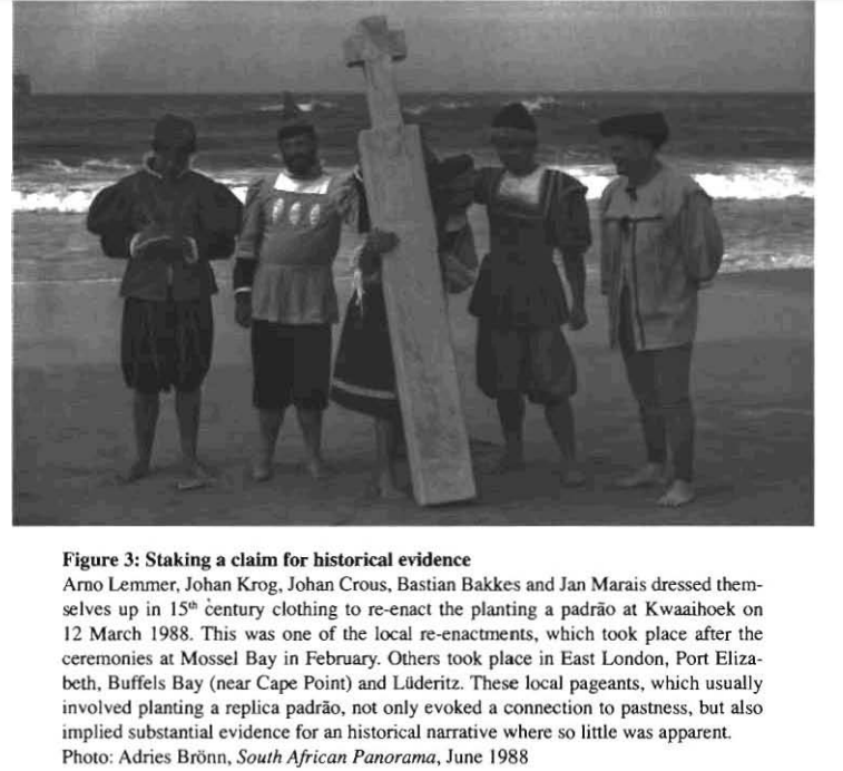 Thus assertions that “the Dias commemoration as ‘a festival for whites’ were repeatedly denied”, despite the festival being conceptualised as a commemoration of the first white man (Dias) entering South Africa. (Witz, 2006) Caio Simões de Araújo points out that Dias hadn’t been celebrated overmuch in early Apartheid, with more commemoration given to the Dutch “pioneers”, but under the new brand, Dias was more acceptable as a figure of commemoration. (de Araújo, 2022)