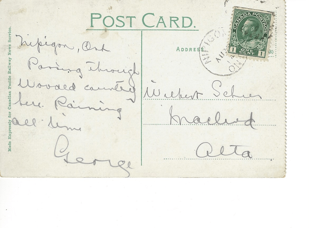 The postcard was purchased in Winnipeg, but North Bay is on Lake Nipissing, on the Quebec border with Ontario. You may note that all these postcards are dated similarly, as George would have been purchasing and writing them at different times, but posting them all together when he was able.