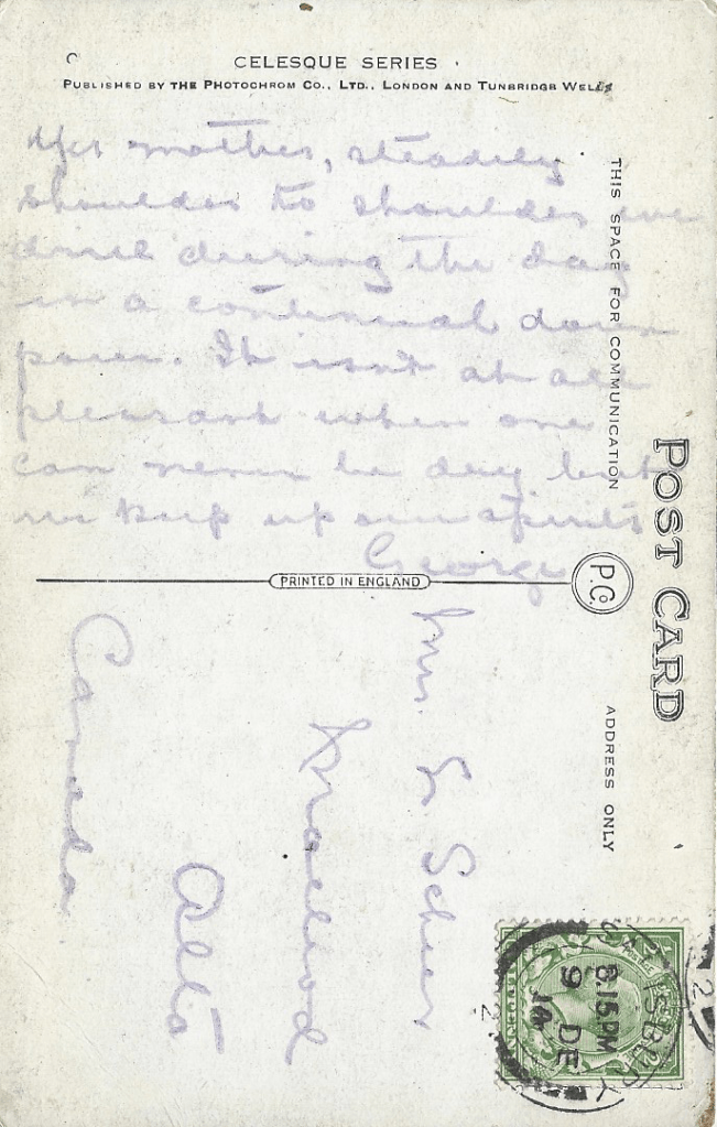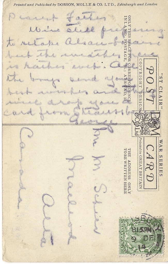 Dearest Father, We’re still preparing to retake Alsace-Lorraine but the weather here is rather wet. All the boys send you best wishes and [they will?] drop you a card from Straussberg [sic]. George.