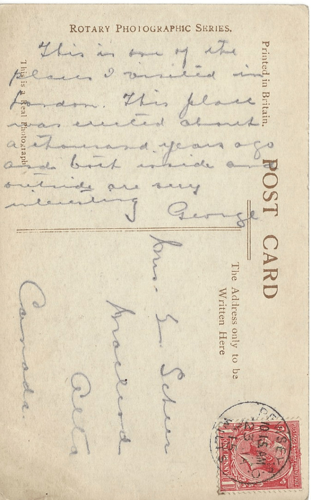 In 2024, my father shared with me some postcards he had kept. They were passed down by his great-grandmother, Eliza Scheer (nee Desmarais) a Métis midwife who ran a boarding house in Fort MacLeod in the early decades of the 20th century. Most were from her son George, who enlisted for the First World War.