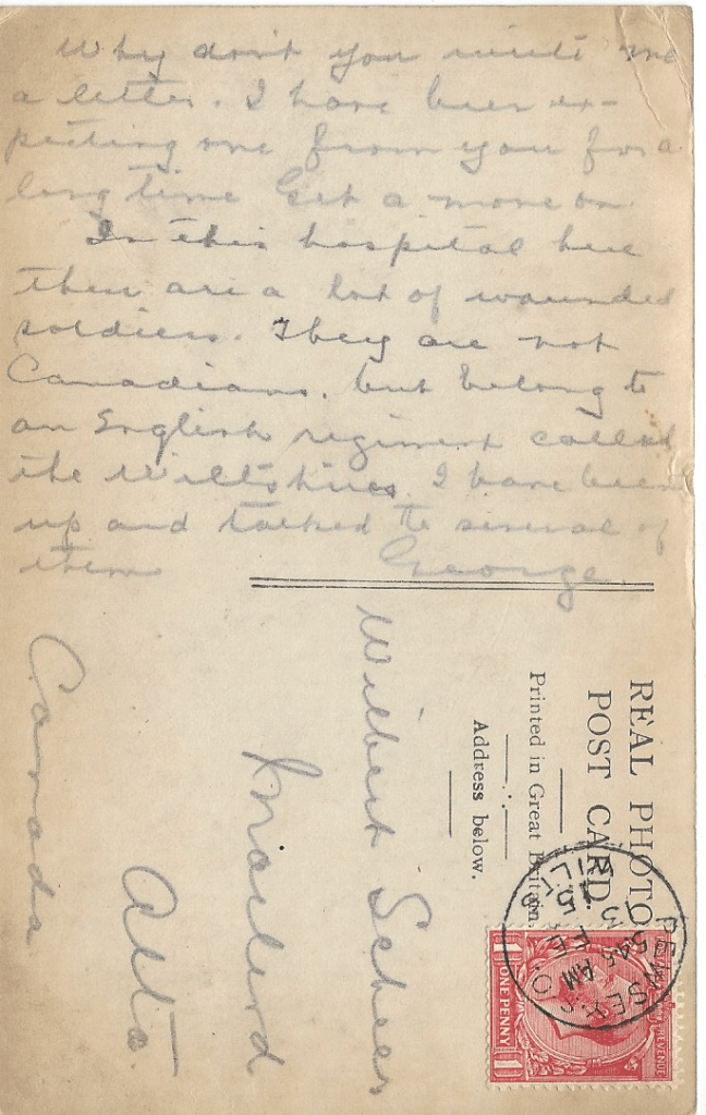 Why don’t you write me a letter. I have been expecting one from you for a long time. Get a move on. In this hospital here there are lots of wounded soldiers. They are not Canadians but belong to England regiment called the Wiltshires. I have been up and talked to several of them. George.
