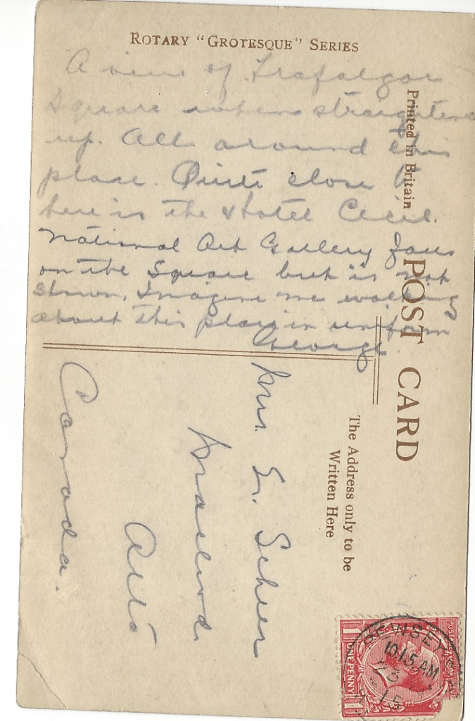 A view of Trafalgar Square when straightened up. All around this place. Quite close here is the Hotel Cecil. National Art Gallery [falls?] on the square but is not shown. Imagine me walking about this place in uniform. George.