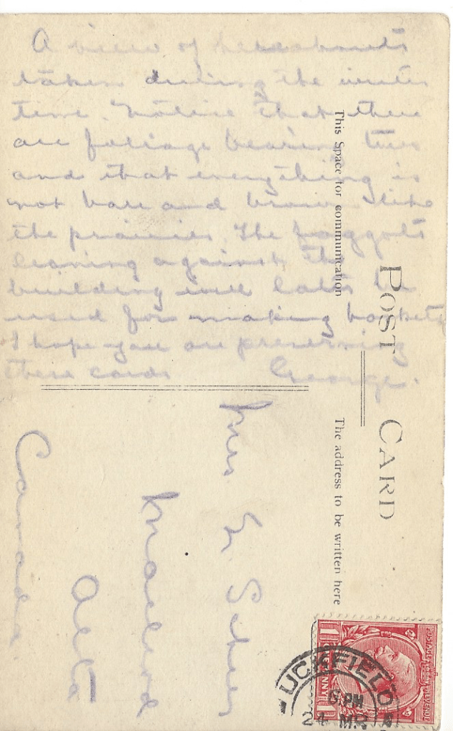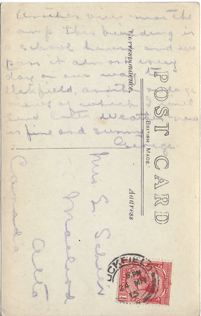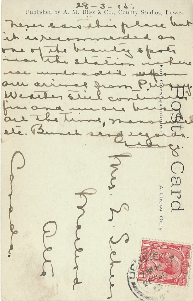 Thus in this collection of March postcards, we find George Scheer and his fellow troopers moved from Pewsey to Uckfield, south of London. It has been seven months since he left MacLeod for the war and he has still not made it to France (although now he is a little closer).