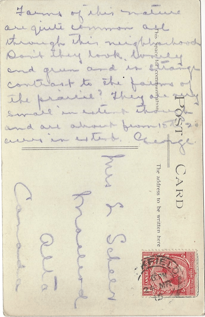 Farms of this nature are quite common all through this neighbourhood. Don’t they look lovely and green and in strange contrast to the farms of the prairie? They are very small in extent though and are about from 15 to 20 Acres in extent. George.