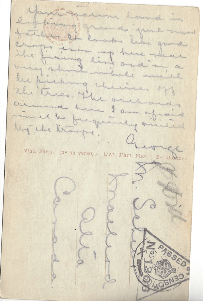 Your native land is looking grand just now father. It looks like good crops even up here near the firing line and in a very short while we will be picking cherries off the trees. The orchards around here I am afraid will be frequently visited by the troops. George.