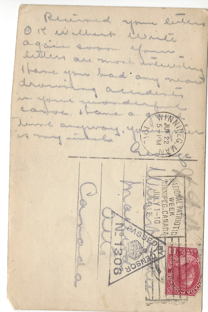 No further cards come to us from 1915 or ’16. At home during this time, George’s eldest brother Arthur attempted to sign up for the war at Lethbridge. My grandfather Laurence Long doesn’t mention it in his family history, so Arthur, at 37, may not have been accepted. Pressure at home for more men to sign up was building as the war continued on and casualties mounted.