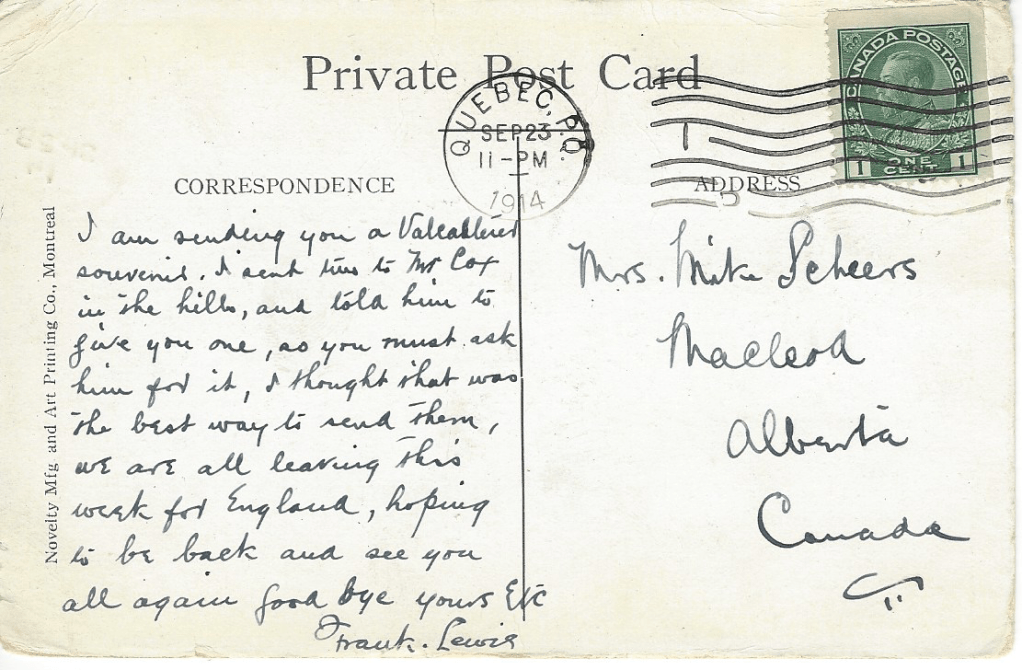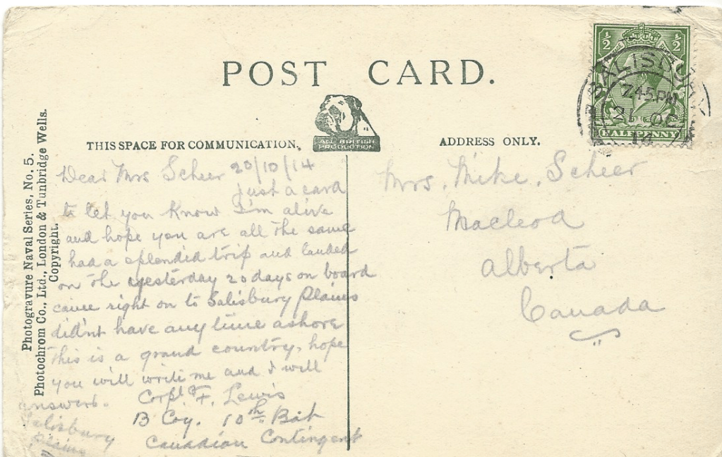 Dear Mrs. Scheer 20/10/14. Just a card to let you know I’m alive and hope you are all the same. Had a splendid trip and landed on the yesterday 20 days on board cause right on to Salisbury Plains. Didn’t have any time ashore. This is a grand country. Hope you will write me and I will answer. Corporal F. Lewis. B Coy, 10th Battalion, Canadian Contingent.