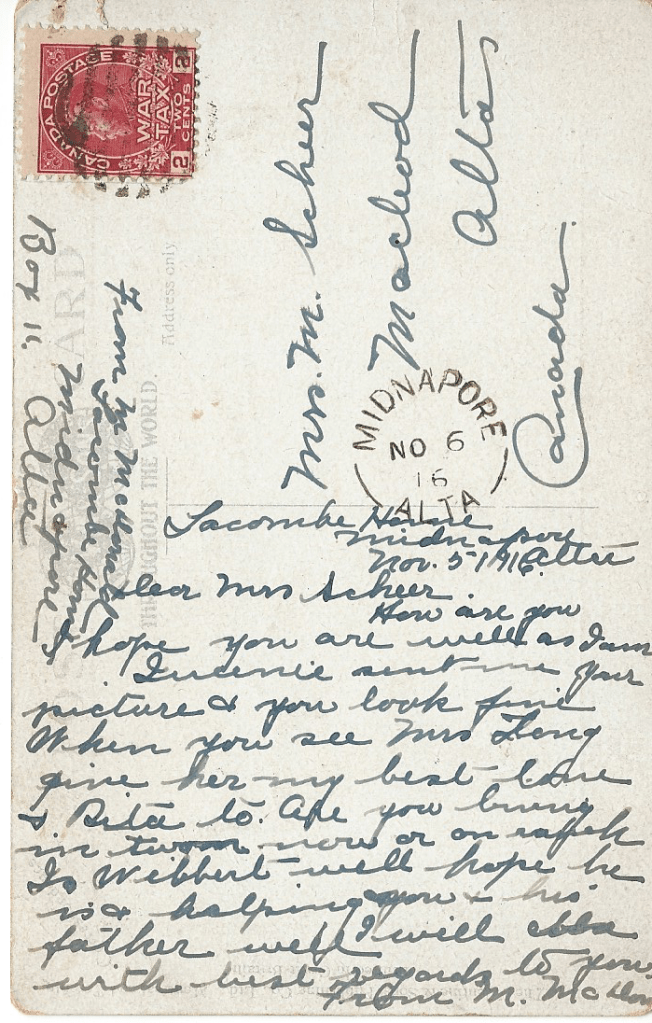 Mrs. M Scheer. Macleod, Alta, Canada.
