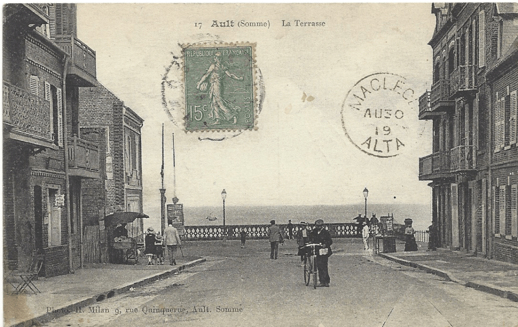 This translates as “See you soon, your sincere friend Alice.” I am afraid it is not clear at all who Alice is or why she refers to Eliza as “Mrs Scheer Georges”. (it may even be addressed to M. Scheer Georges, meaning Monsieur – I cannot be sure). It is relevant here to remember that Michael Scheer, Eliza’s husband, was a Frenchman, and that Eliza’s daughters all learned to read and write French. The image on the postcard is by H. Milan and depicts Rue quinquerue somme in Picardie, France.