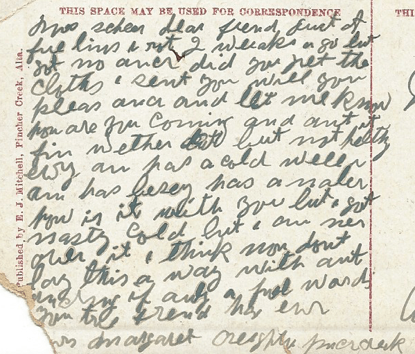 “Mrs scheer dear frend just of fue lins I rot [sic] 2 weaks ago but got no ancr [sic] did you get the cloths I sent you will you pleas ancr and let me know how are you coming and ant it fin wether about but not helthy evry on has a cold well I am has busey has a naler how is it with you but I got nasty cold but I am ner over it I think non dont lay this a way with aut [unintelligible] words you true frend has ever [yo]urs Margaret [unintelligible]”