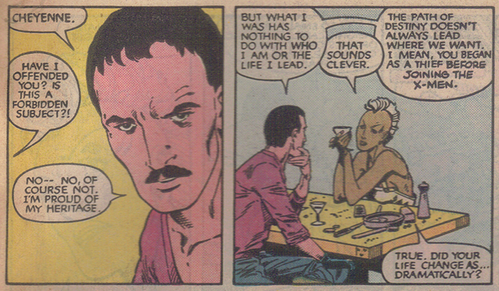 Credit to Claremont again, he introduced a half-dozen or more diverse Indigenous characters into X-Men/Marvel (some better than others). Contrast Forge, for instance, with his fellow Cheyenne, Danielle Moonstar, in New Mutants. Dani straight up tells Professor X that his dress code is bullshit and she’ll include as many Indigenous elements as she wants.